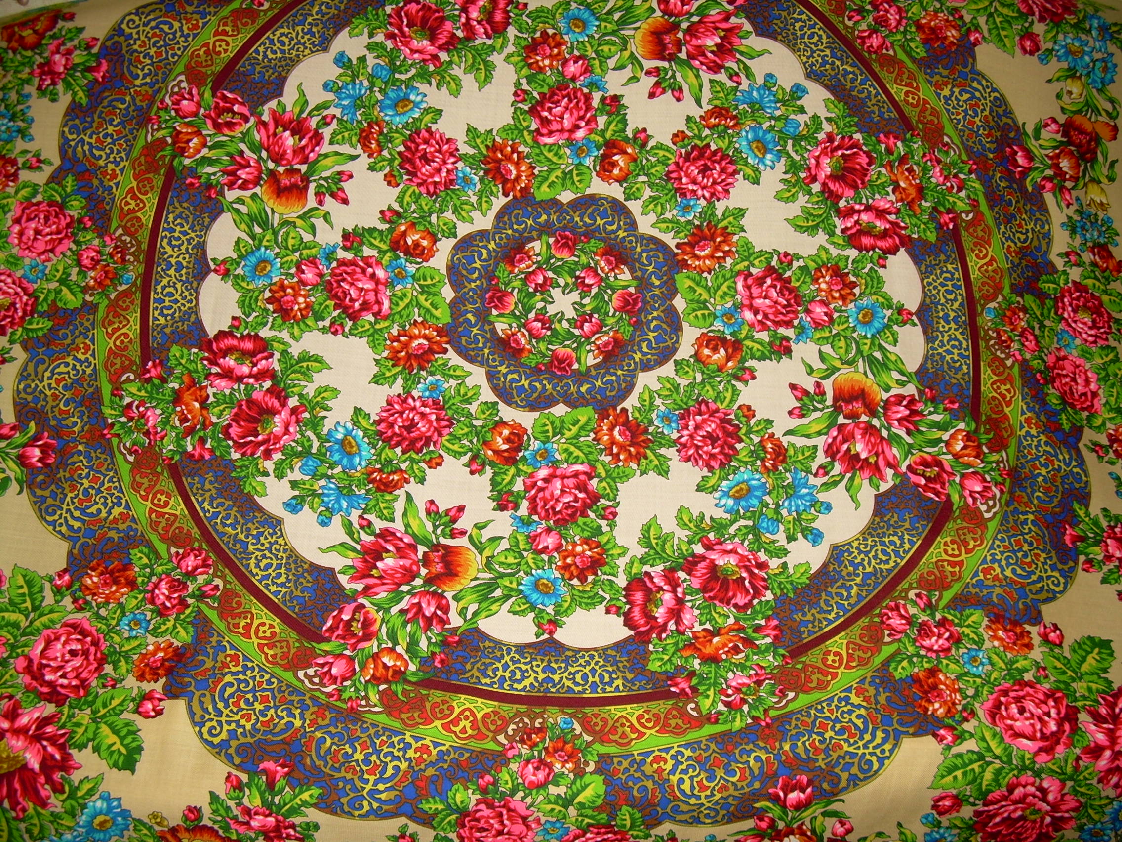 Благодаря нашей форумчанке Ganesha у меня появилась роскошная шаль "Русский узор"!Потрясающе богатая и насыщенная!Такое буйство цвета,переливы золотой ленты на бело-бежевом фоне!Как говорил один царь-"Только в праздник ее одевать!" Мне кажется,она не потерпит рядом с собой никаких аксессуаров.Да и одежду надо подобрать простую,чтобы была всего лишь фоном.К сожалению,фотографии не передали всей сочности цвета