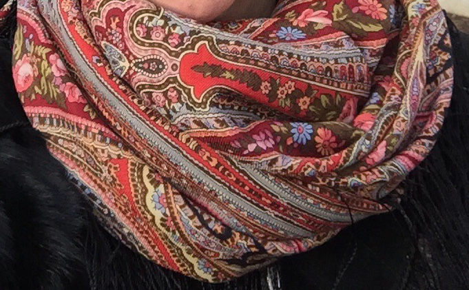 (Кликните, чтобы почитать, что спрятано под катом)...Повторю, но экземпляр старой печати, который я примеряла, был вообще глухой, казался каким-то грязноватым, очень мне не понравился, а эта красивая и нежная шаль, спокойная. Предполагаю, что и раньше были вариации печати и мне могло просто не повезти. ИМХО 18-ый колорит не для дам с собственными яркими красками, а вот если свои цвета мягкие, то заиграет и подчеркнет.