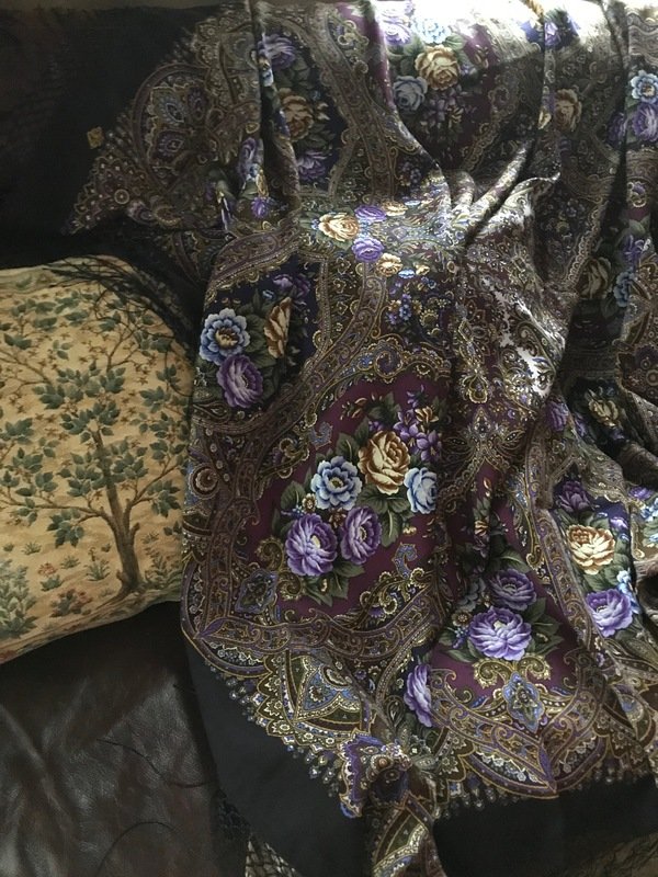 Особенно порадовала фактура ткани--мягкая, пластичная, обволакивающая. Сразу скажу, что самый светлый лиловый цвет , особенно в центре шали) никак не хотел фотографироваться-- и все равно получился, серо-голубым и слишком светлым. В реальности это--розово-лиловый , совсем не бледный цвет!(Кликните, чтобы почитать оффтопик)... Простите за это несоответствие. Остальные цвета--соответствуют действительности! Смотрим...(дневной свет, пасмурно)