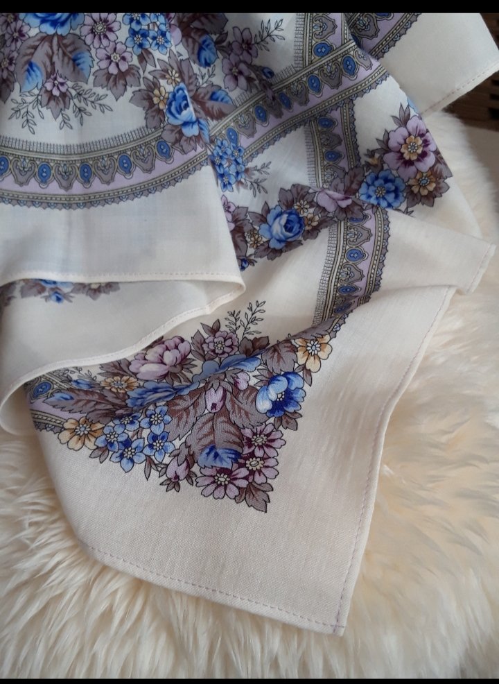 Хотелось бы показать результаты моего первого опыта по подшивке платка. Расскажу сначала предысторию. Впервые о ПП платках я узнала года 3 назад, и сразу были куплены 3 платка 125х125, среди которых была "Ольга Лабзина". Два купленных платочка активно носились, постепенно появлялись (и носились) другие, а "Лабзина" так и висела невостребованной, ни разу не выгулянной. Поняла, что мешает именно белая блестящая бахрома (хотя цветная бахрома не напрягает). Бахрому сняла, но все равно носить не могу. Надеваю и тут же снимаю - мешает широкая белая кайма. В итоге решилась переподшить московским швом. Конечно, в процессе было много проблем, да и результат далек от идела (честно говоря, последний раз я шила лет 25 назад еще в школе на уроках труда), но теперь платок точно будет наконец-то выгулян. Кайма получилась чуть уже, чем планировала, т.к. по неопытности оставила слишком мало на срез, и уголки, конечно, могли бы быть аккуратней, но в намотке все эти детали не видны.