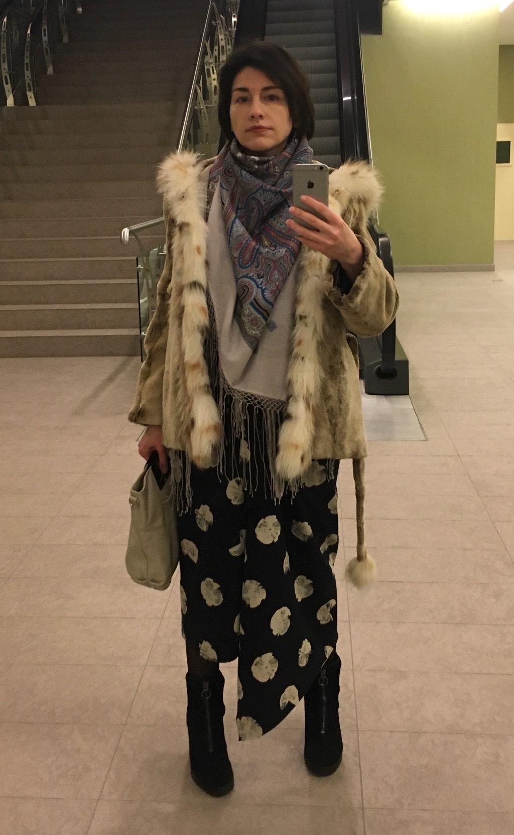 Миндаль-20, ибо я сегодня белая, светло-серая, серая и черная, а под такое меня всегда тянет либо на Миндаль, либо на Молитву. Белое - это сапоги, дождь сегодня изрядный, вытащила непромокаемые резиновые, пришлось уравновешивать их пышной юбкой и витиеватым Миндалем.