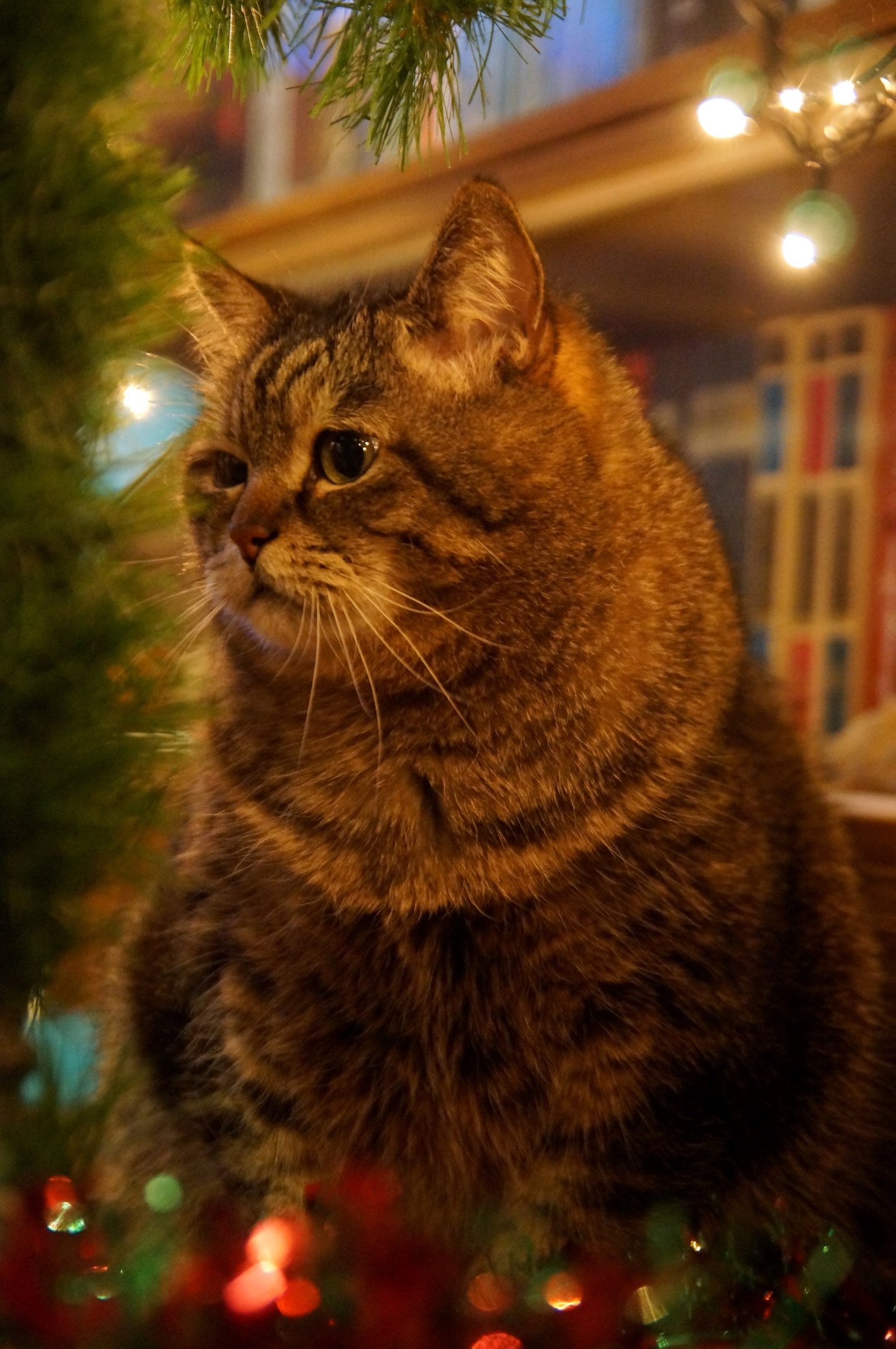 Anni, ему всё ещё интересно. Что-то шуршит, что-то блестит, откуда-то появляются подарки. На нижних ветках только ерунда не бьющаяся. Слава богу, дождик и гирлянду не жрёт и в обезьяну не играет.