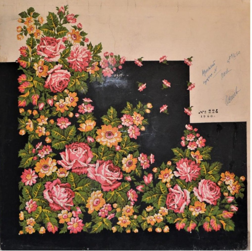 Рисунок эскиза выполнен на черном фоне. Плотно заполнен растительным орнаментом угол, несколько меньше по краю, оставляя середину свободной. Основным элементом рисунка является крупная бело-розовая роза и большое количество мелких желтых и розовых цветов.