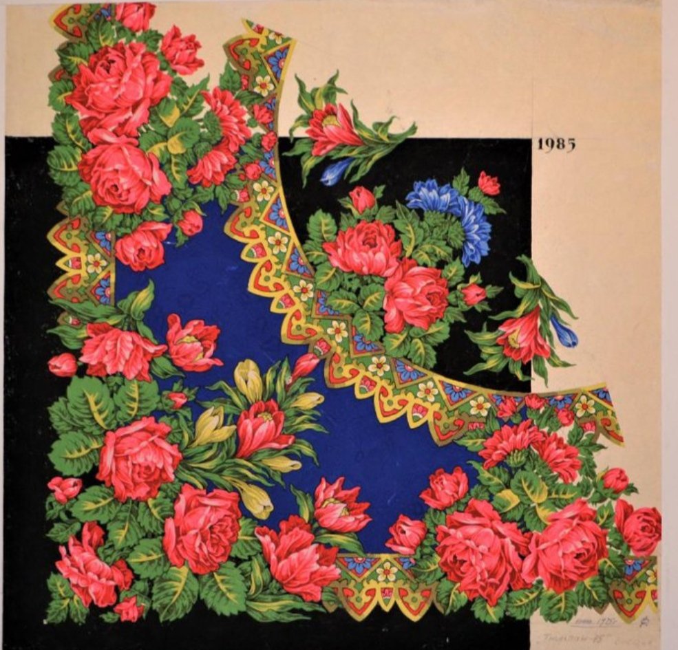 На черном фоне эскиза платка располагаются гирлянды крупных ярко розовых и желтых роз, синих и желтых люпинов и других желтых,синих более мелких цветов.