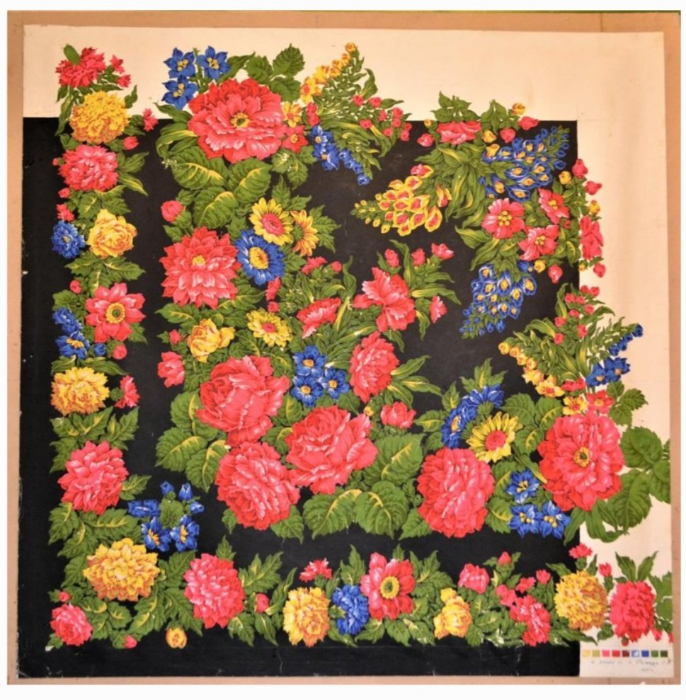 На черном фоне эскиза платка располагаются гирлянды крупных ярко розовых и желтых роз, синих и желтых люпинов и других желтых,синих более мелких цветов.