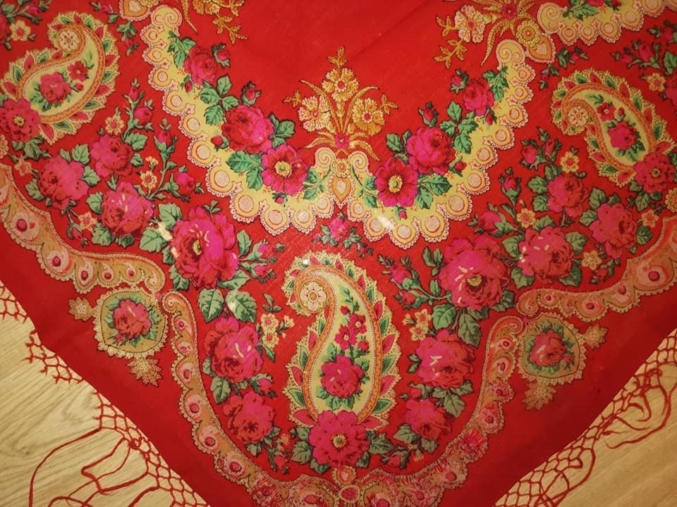 Вернее, не платок, а половина платка с бахромой. Часто режут платки по диагонали, чтобы правильно повязать голову и плечи.