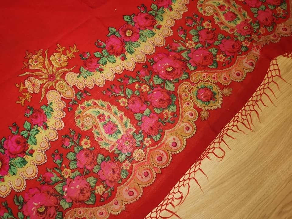 Вернее, не платок, а половина платка с бахромой. Часто режут платки по диагонали, чтобы правильно повязать голову и плечи.