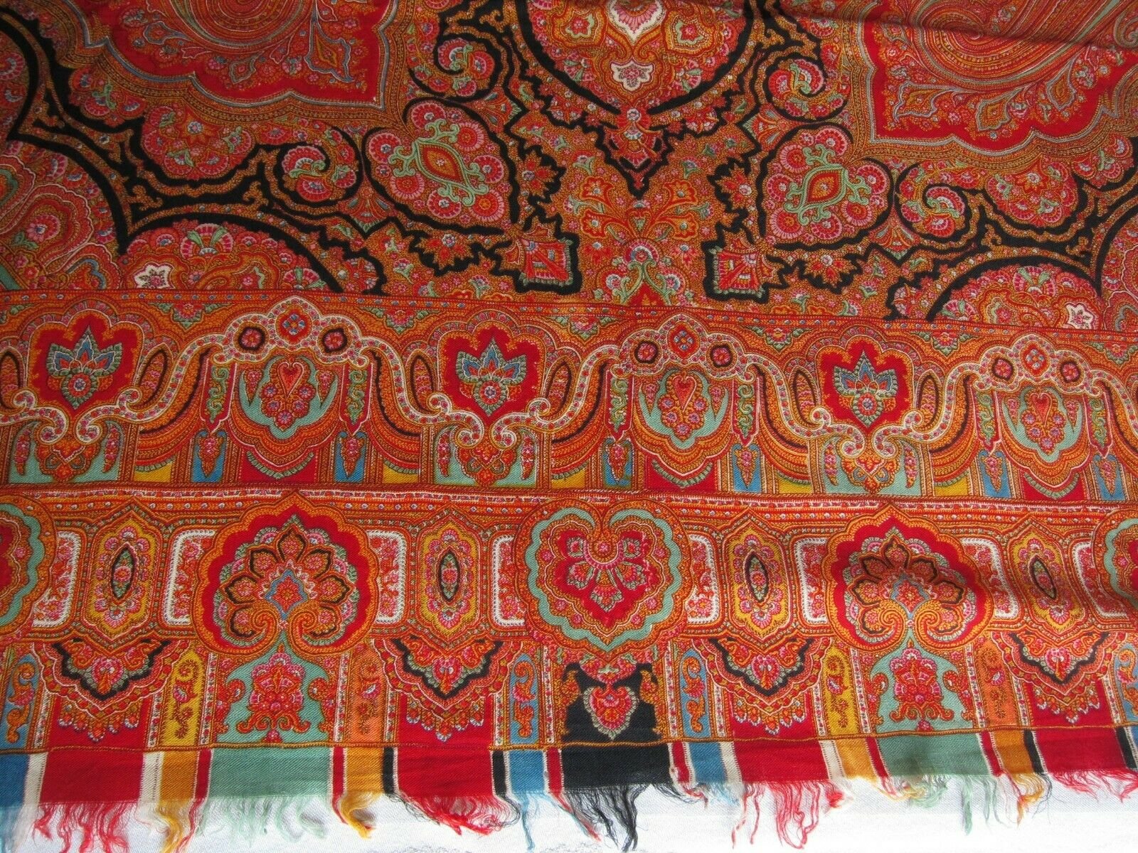 Шаль, шерсть/шелк, ручная блочная печать, линейный дизайн, фисташковый грунт, длинная шелковая бахрома, 1850-е гг.