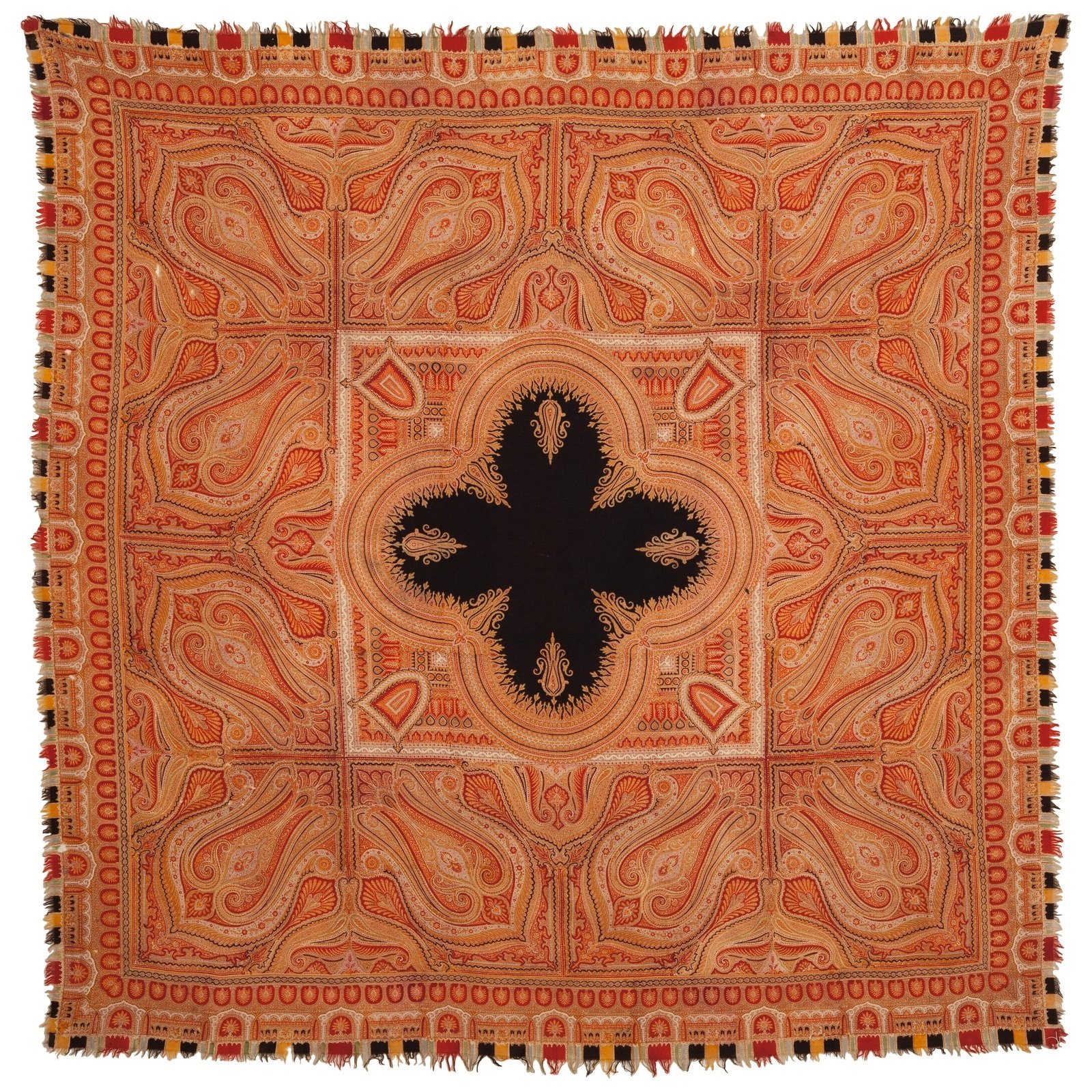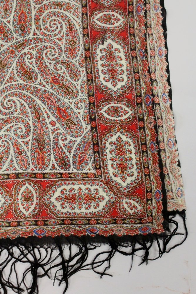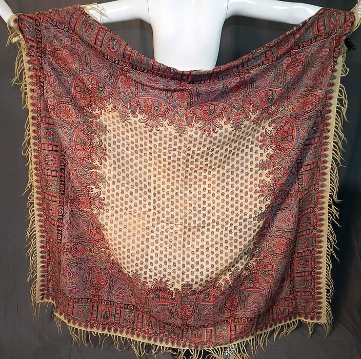 Ранняя викторианская шаль из тонкой шерсти Чаллис с набивным рисунком пейсли с бахромой, 1850-е гг.