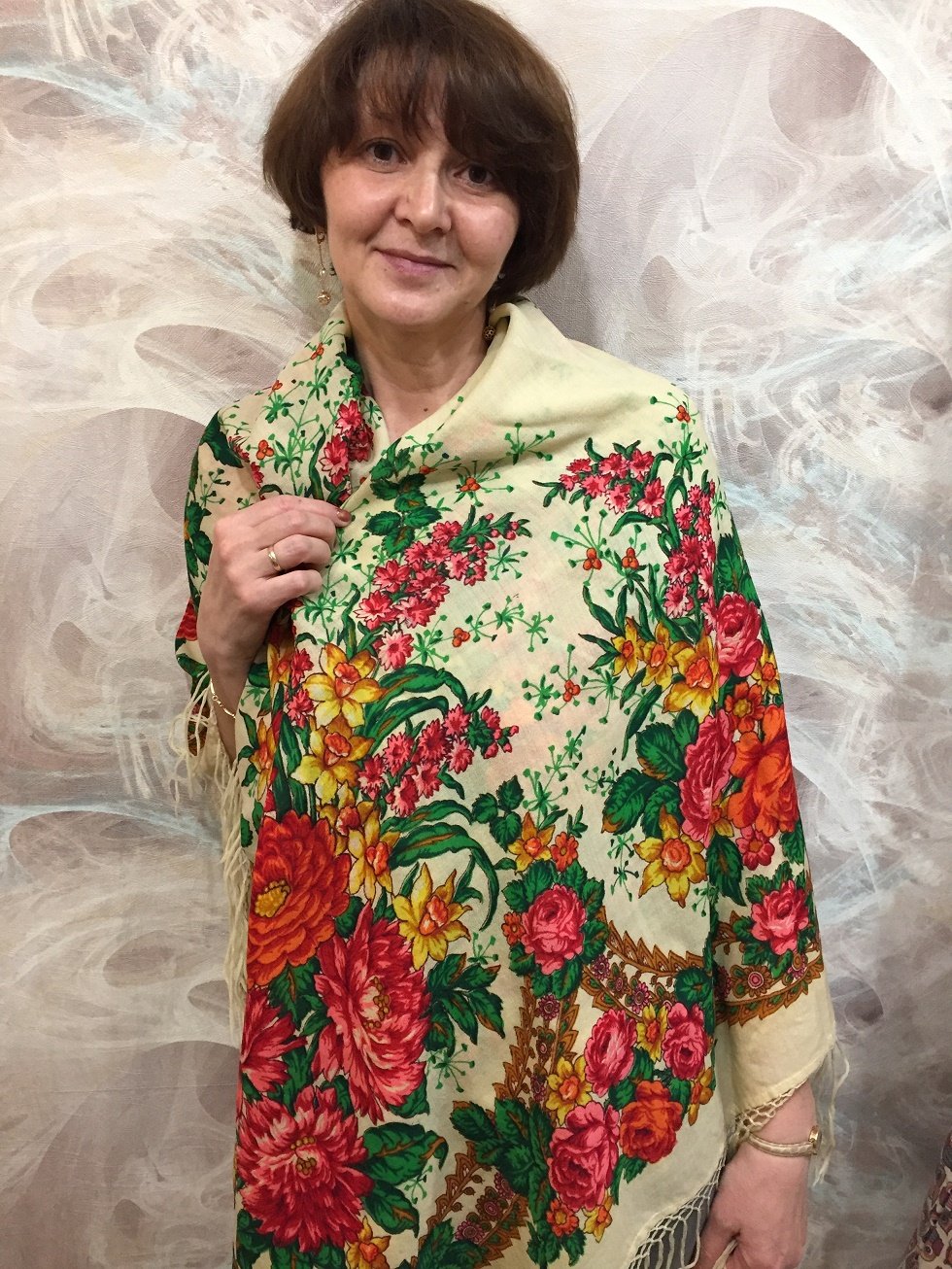 Платочек ППО_51 ("Платок шерстяной 125х125 с о стилизованным растительным восточно-орнаментальным мотивом"), колорит - ?, мягчайшая шерсть (цвет несколько высветлен из-за вспышки)