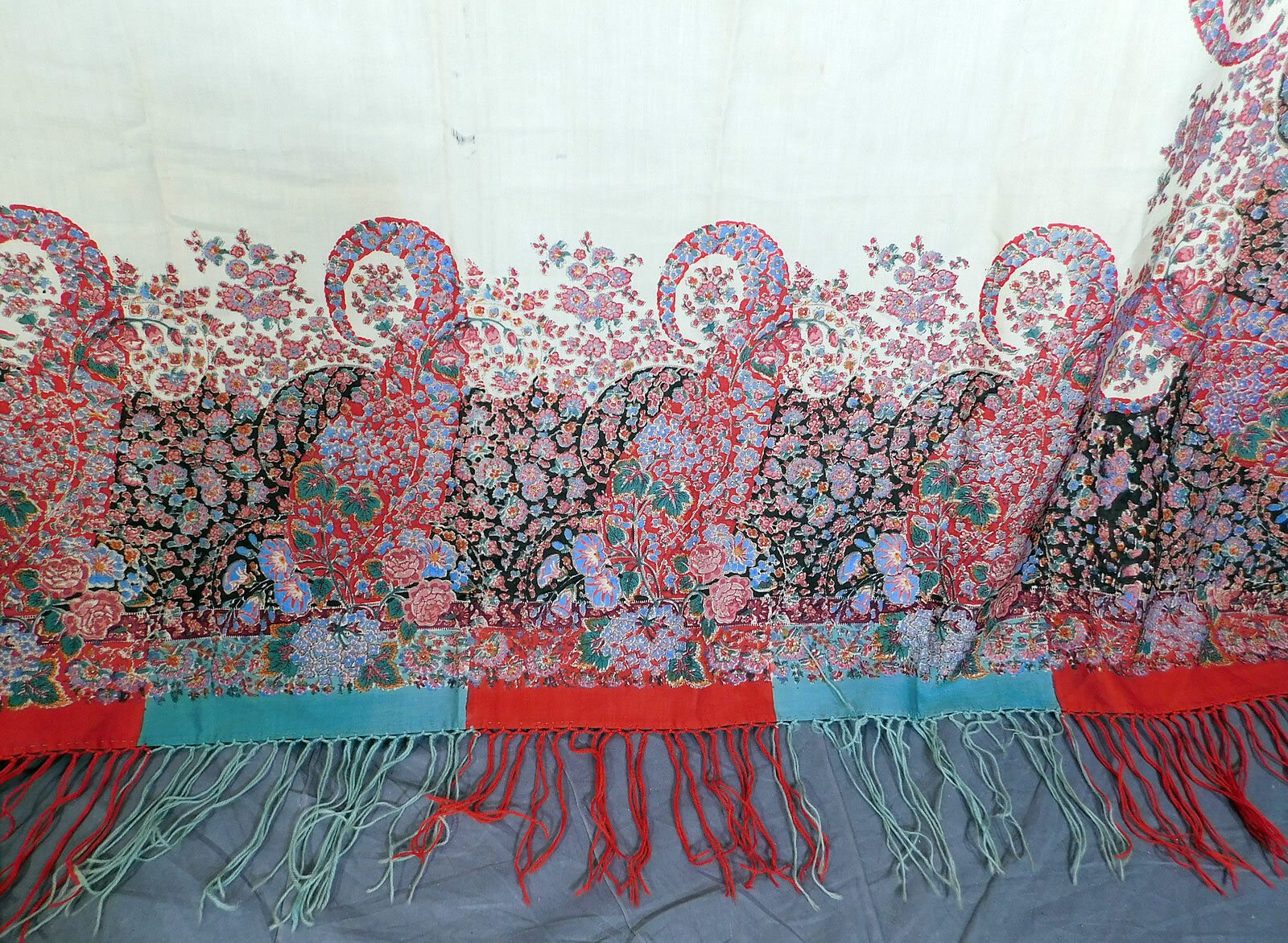 Викторианская шерстяная шаль с набивным многоцветным рисунком пейсли и бахромой, Англия, Норидж, до 1890 г.