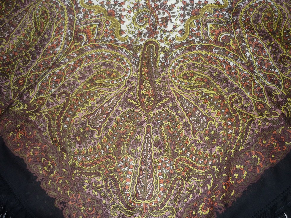 Размер платка уменьшен, элементы орнамента сближены. Рисунок выпускался в нескольких колоритах. На форум прилетело пока только два! Первый по цветовому наполнению близок к оригиналу. Должен быть ещё зелёный колорит. Быть может, прилетит когда-нибудь))