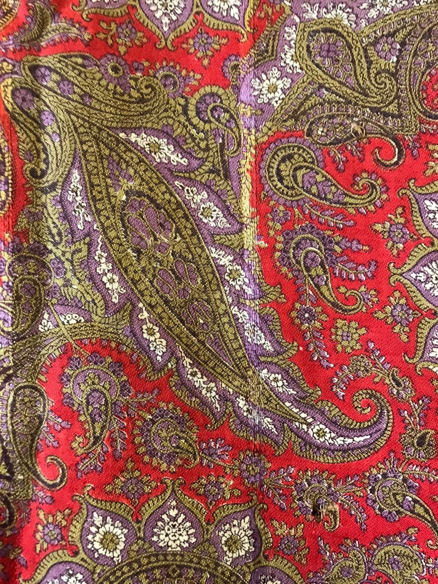 Старинная шаль, тонкая шерсть/шелк, с просновками, ручная набойка, рисунок пейсли ярких цветов, с 1860 гг.