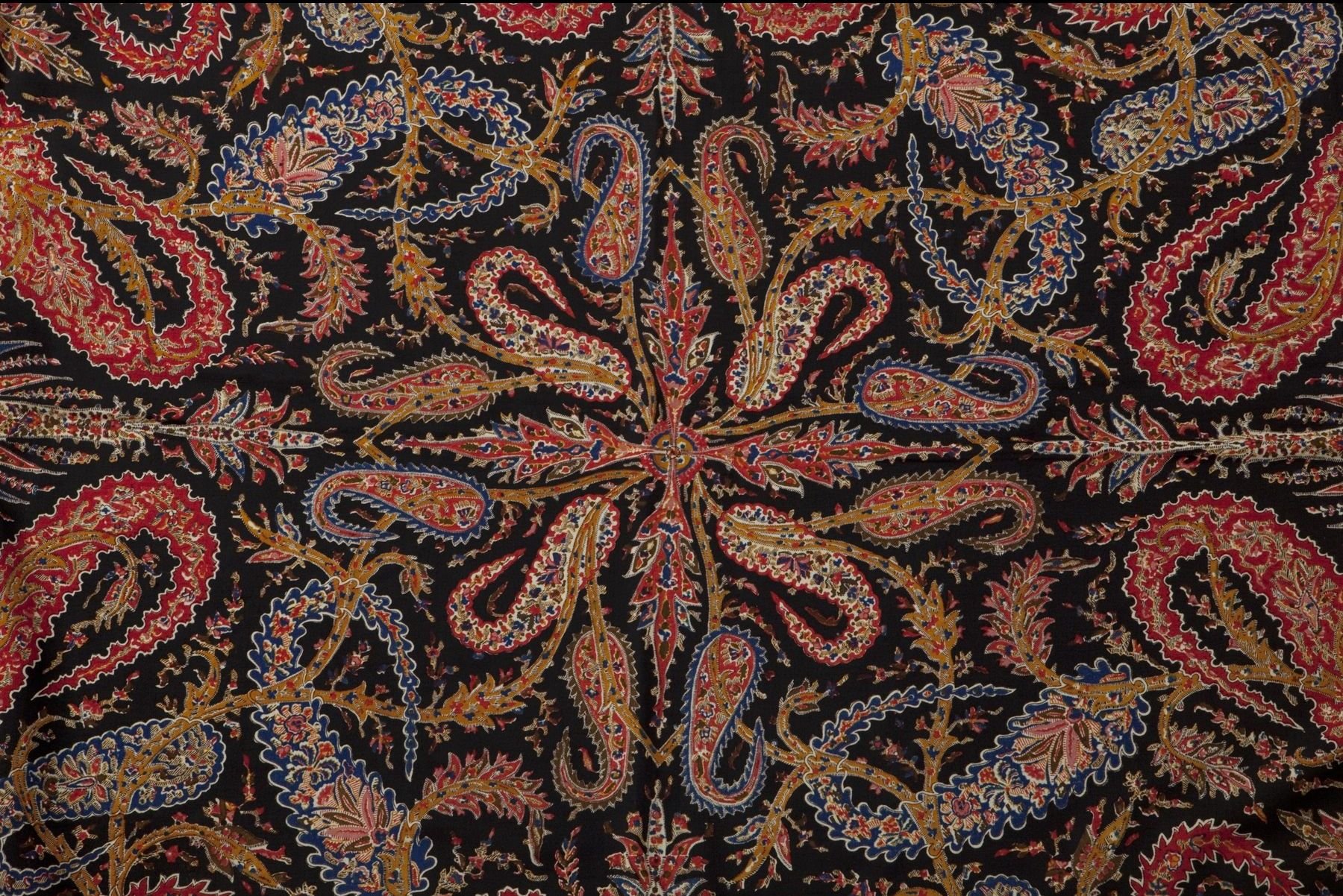 Шаль кашемировая набивная, цветочный декор на черном фоне, произведена в Мюлузе (Франция), конец XIX в.