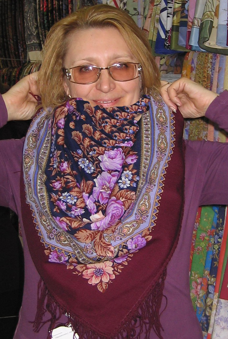 Открытием для меня стал платок Павловские розы-7. На картинке абсолютно его не понимала. Как же платок на Вас раскрылся!!! Уже знаю, что он у меня непременно будет. Придумала и как буду носить и с чем. Немного напрягает кайма бордовая, срежу, вероятно, почти всю практически, навяжу длинной шелковой светлой бахромы и непременно возьму с собой в отпуск. Спасибо за показ! Один взгляд на Ваше фото и пропала! Вот уж не ожидала, что влюблюсь в этот колорит вдруг и накрепко. Это же прохладная лунная ночь! Насколько красив этот глубокий синий цвет!