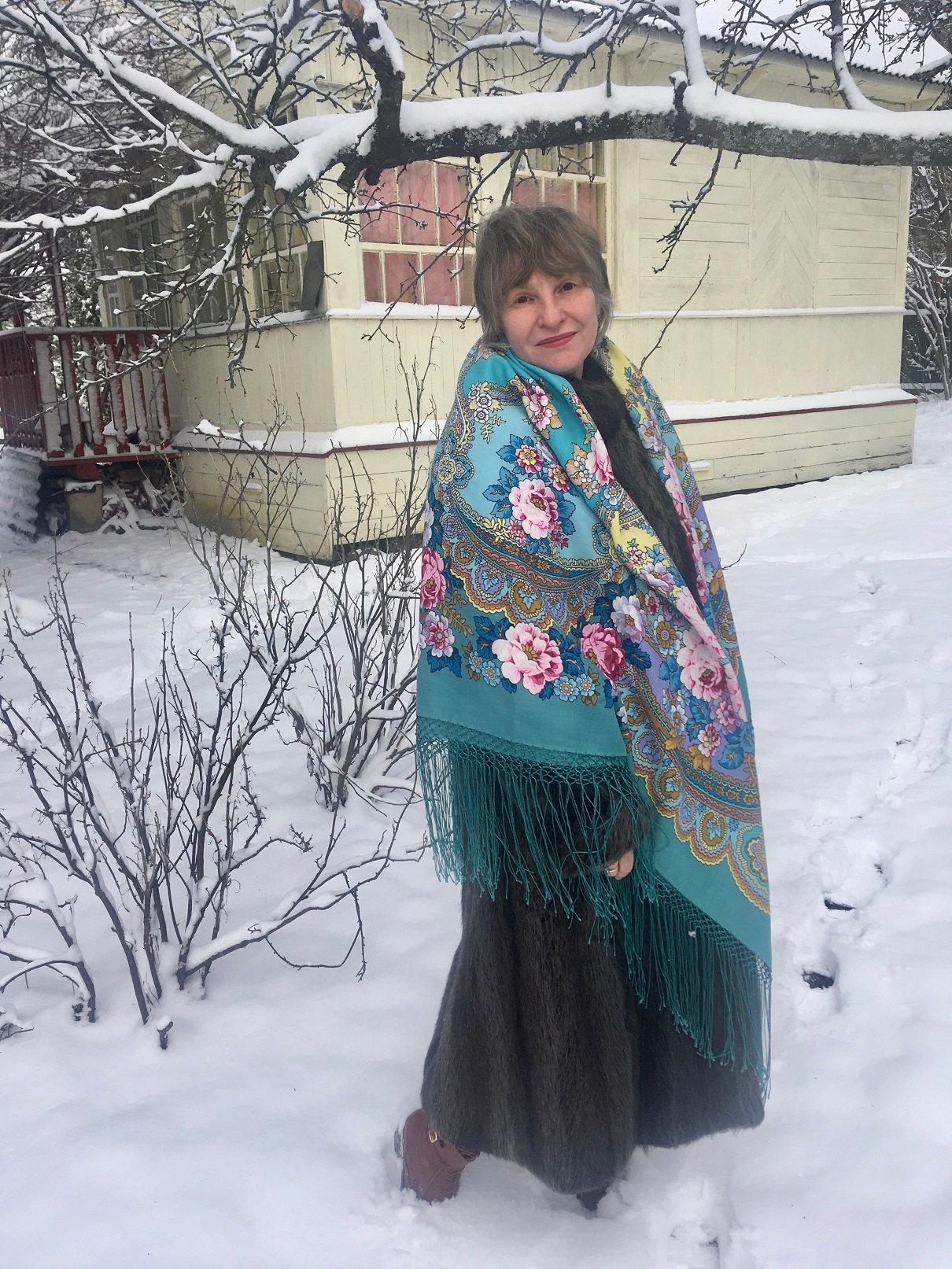Возвращение, как и любой другой платок, в рисунок которого выписаны любые красные, розовые, или оранжевые цветы, будет подчёркивать румянец на почти что любом лице, если цвет румян правильно выбран. /шутка/ но как и в любой шутке в ней есть доля правды/ возможно именно поэтому я фанат цветочных мотивов/