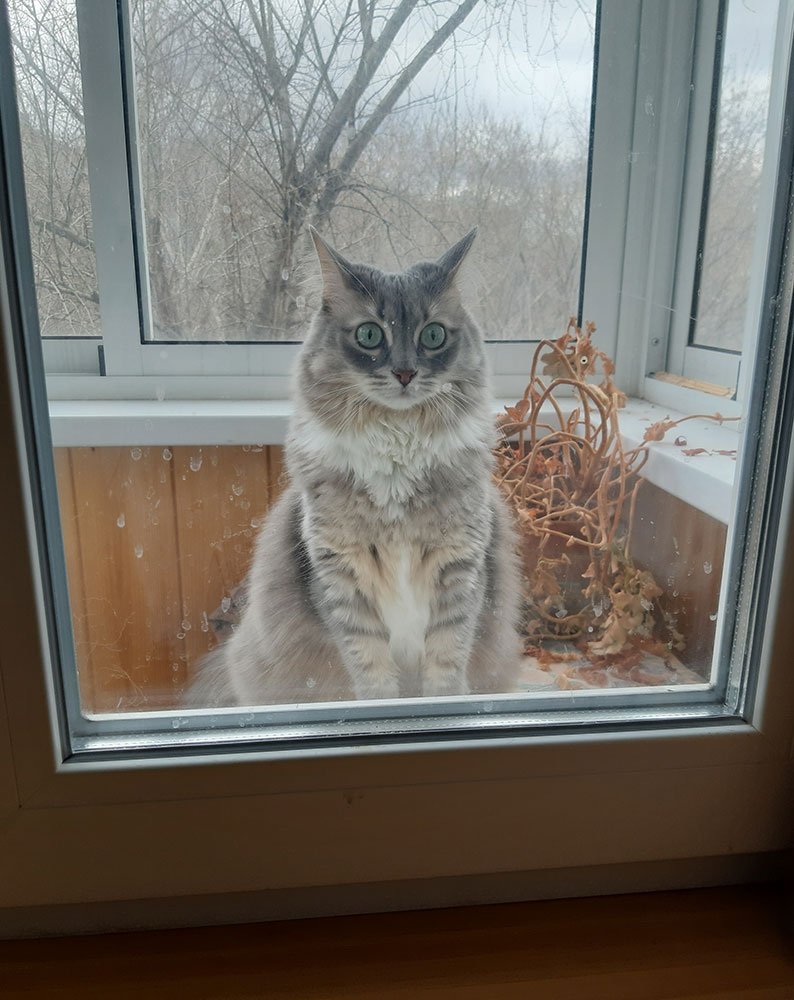Смотрит на меня через окно, нагулялась, глаза квадратные, срочно пустите домой.