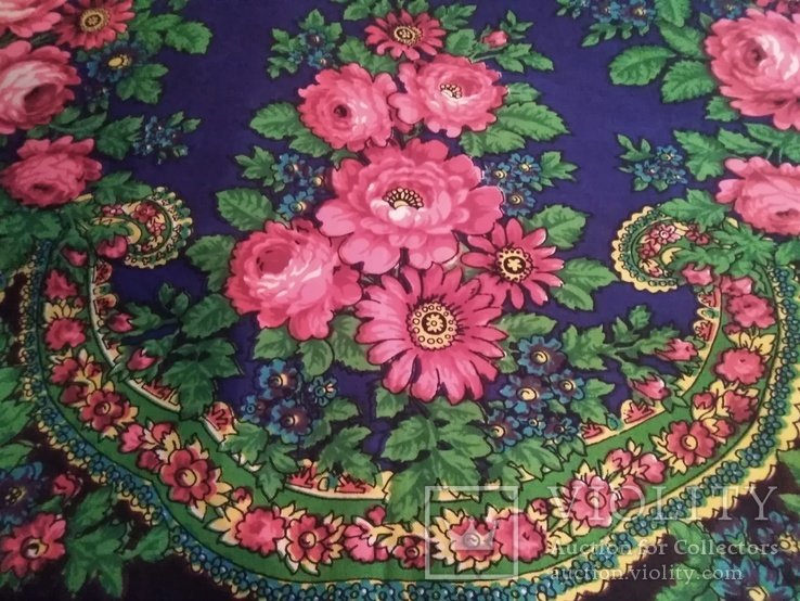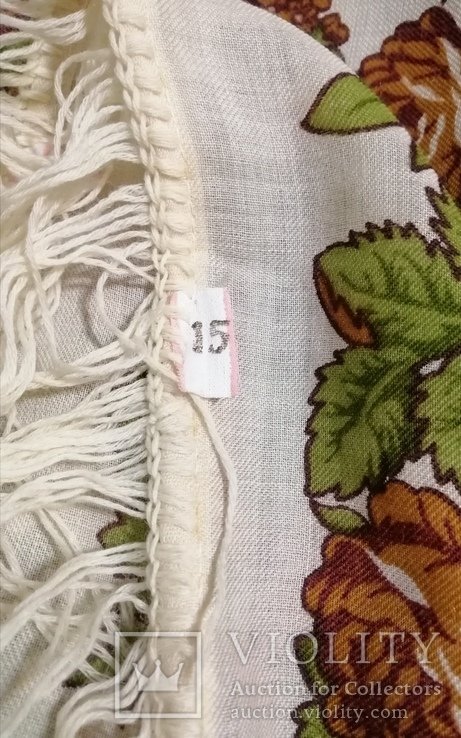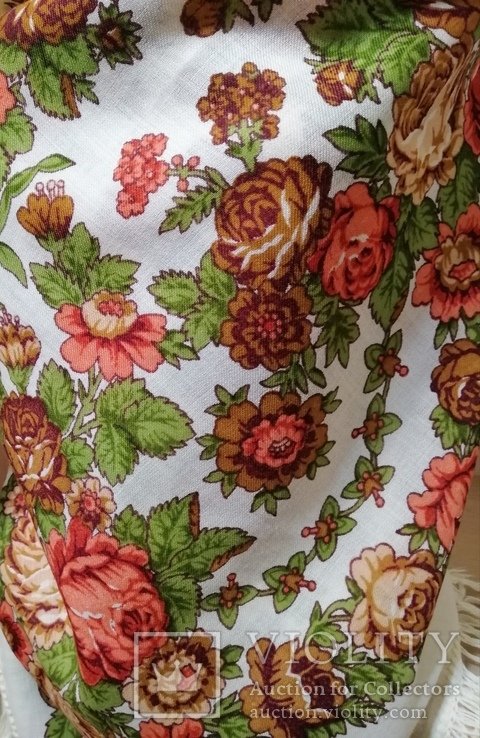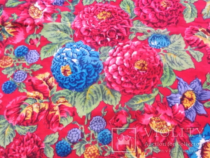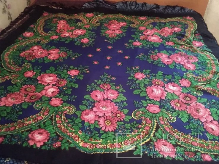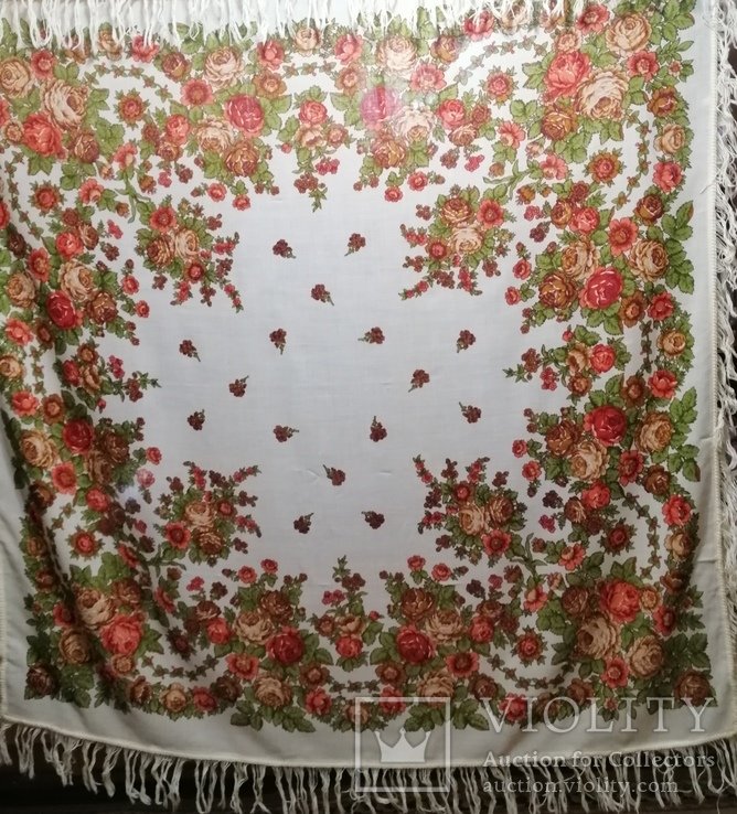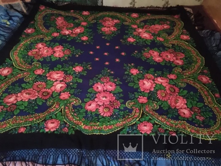 Платок из шерстяного муслина. Квадратное полотно – черный грунт, с фризом шириной около 25 см с турецким рисунком и розами в группах, напечатанных в виде гирлянды. Окантован шерстяной бахромой длиной около 17 см . Произведен в 1910-х годах. Размер 133 х 131 см
