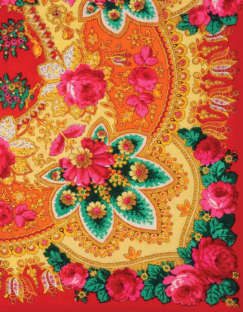 Платки разных расцветок (в основном красные) и с разными рисунками, большинство из которых – вариации Цветочного веера и Сиреневого вечера.