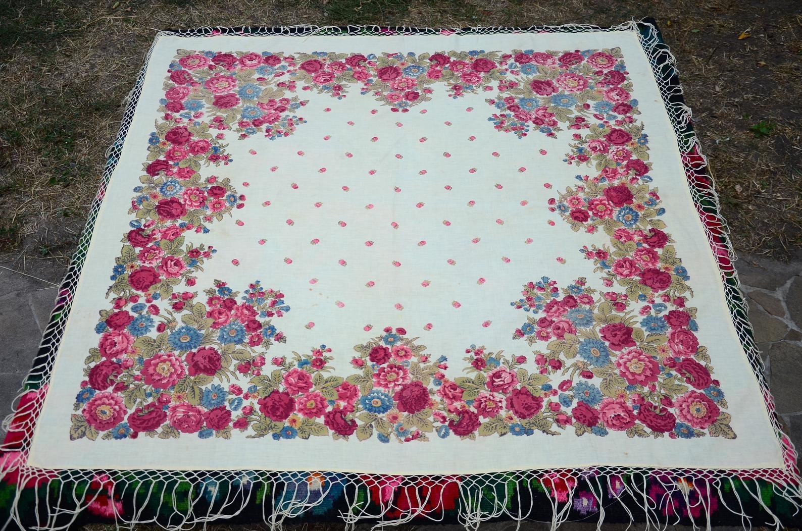 Шаль выполнена в бордово - розовой цветовой гамме, середина шали заполнена мелкими цветочками, по краям шали букеты из роз и георгинов, соединенные гирляндой фиолетового цвета. Бытовала в казачьей, мещанской, купеческой среде.