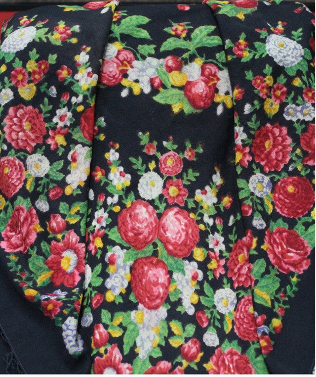 Платок прямоугольной формы. Фон окрашен в коричнево-бордовый цвет, по краям более интенсивного тона. В центре черная рокайльная розетка из завитков листьев аканта охристого цвета и восьмиугольной звезды с белым меандровым орнаментом. Внутри нее восьмигранник, на черном фоне которого расположен букет из красных маков, белых ромашек, зеленых листьев и желтых колосков. Такие же букеты по углам и меньшие по размеру в центре каждой из сторон. По периметру рокайльный бордюр светло-охристого цвета из завитков листьев аканта, пальметт и меандрового орнамента белого цвета. По утковым сторонам короткая бахрома.