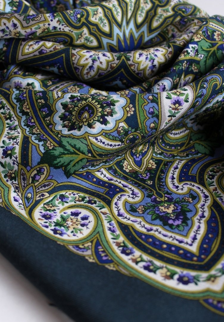 . Совершенно сиреневый, лавандовый, лиловый , достаточно темный и очень красивый платок. Прекрасно сочетается с болотным и хаки ( этот цвет есть в рисунке). На фото получается голубее и более серо-коричневым.