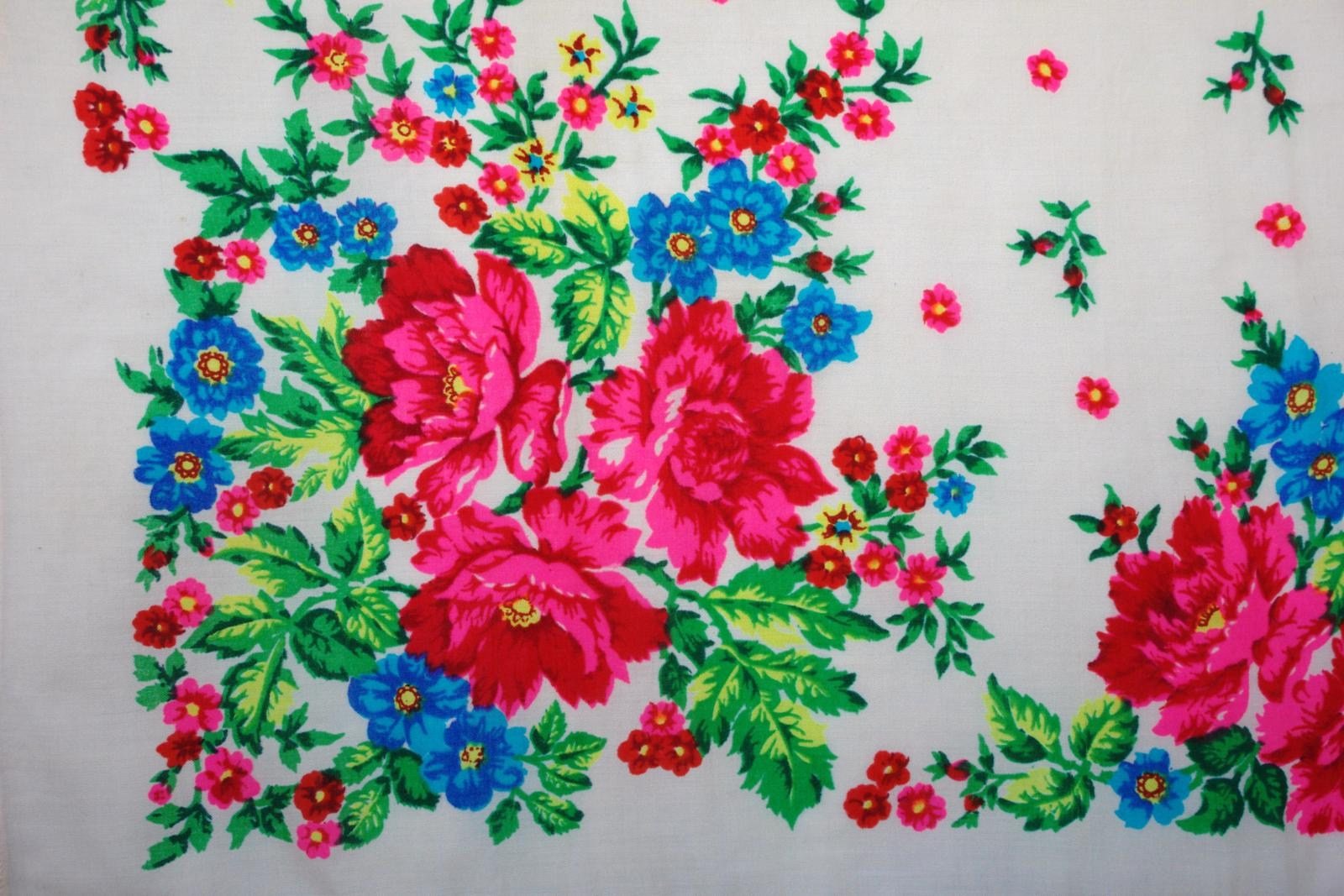 Ткань выношена, конечно. Состояние не очень. Но рисунок читается отлично: ручная набойка на смесовой ткани, интересный плоский орнамент по кайме; "бордюр" с розами и маргаритками; ближе к среднику "лента", образующая сложную объёмную фигуру - амулет на счастье и долголетие, на которой "подвешены" изящные букетики...