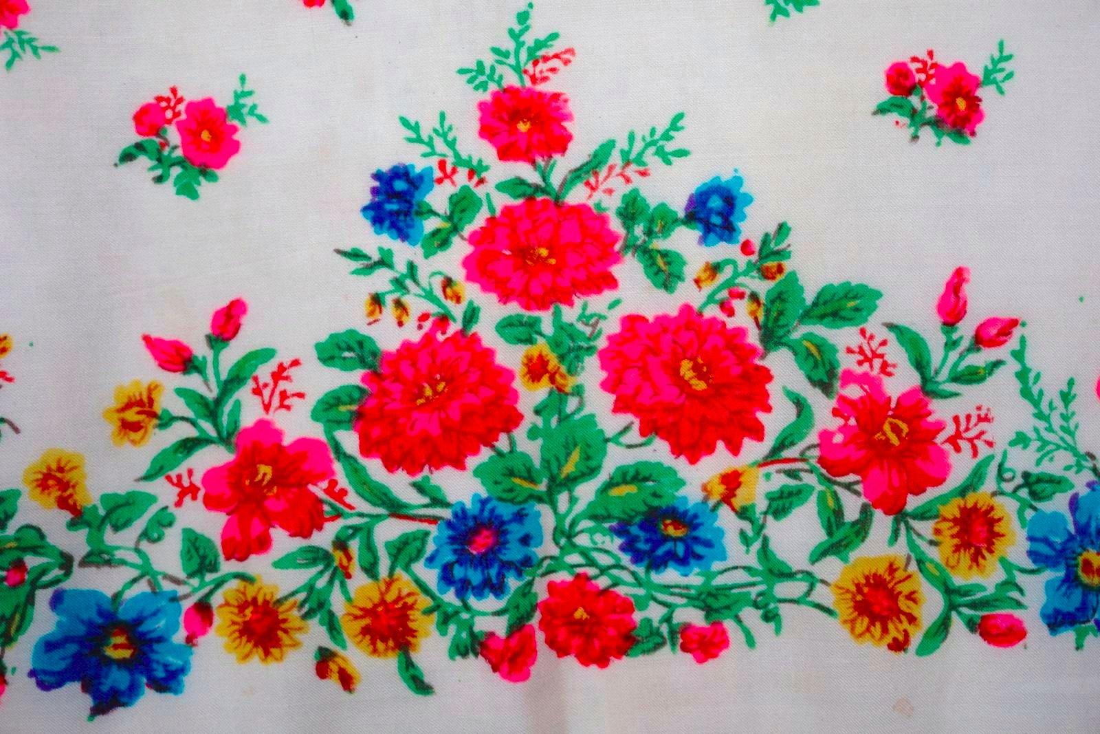 Ткань выношена, конечно. Состояние не очень. Но рисунок читается отлично: ручная набойка на смесовой ткани, интересный плоский орнамент по кайме; "бордюр" с розами и маргаритками; ближе к среднику "лента", образующая сложную объёмную фигуру - амулет на счастье и долголетие, на которой "подвешены" изящные букетики...