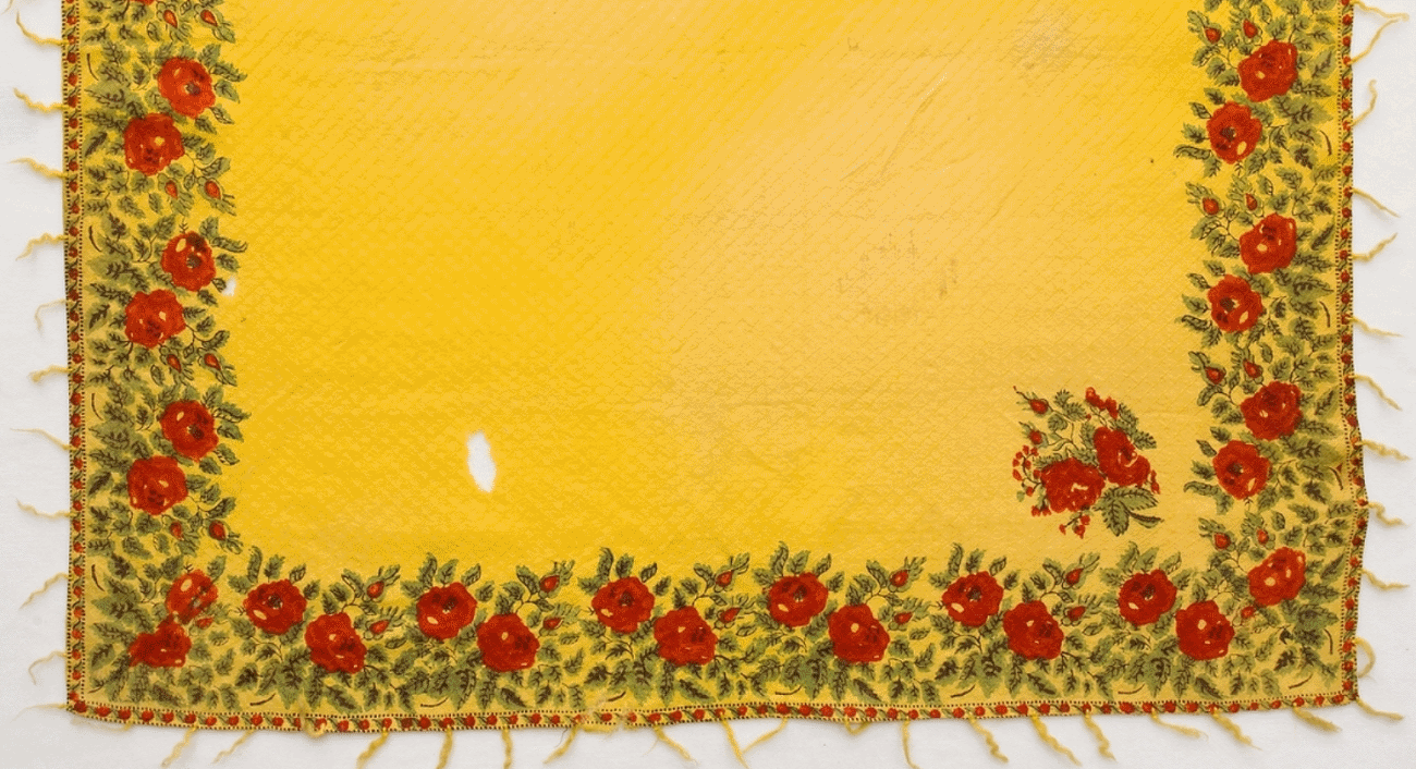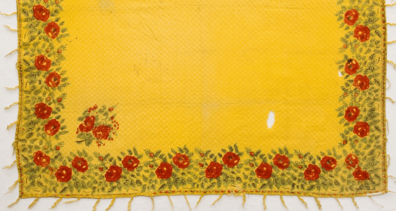 Квадратный платок, или маленькая шаль из желтого шерстяного муслина с тканым диагональным клетчатым узором и набивным цветочным рисунком ярко-красного, зеленого и слабо-черного цветов. В двух углах букеты роз, рамка из роз, бутонов и листьев.