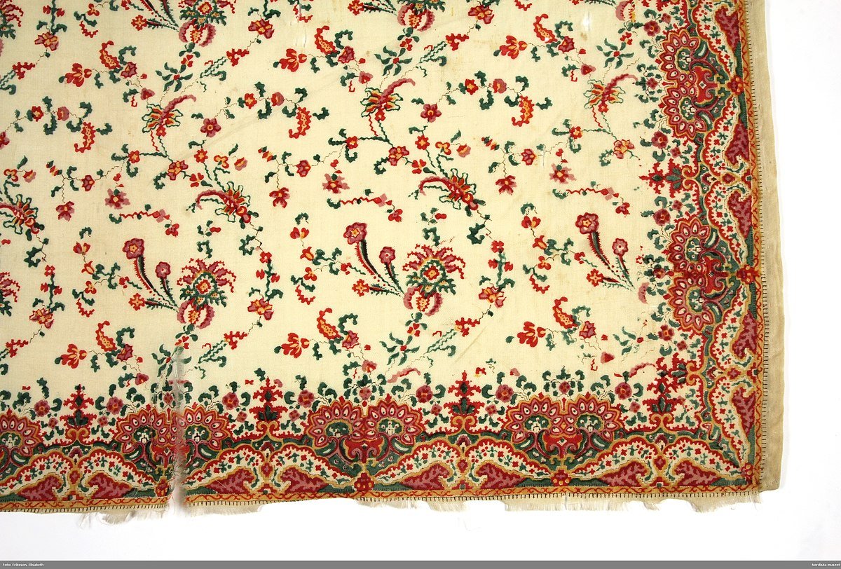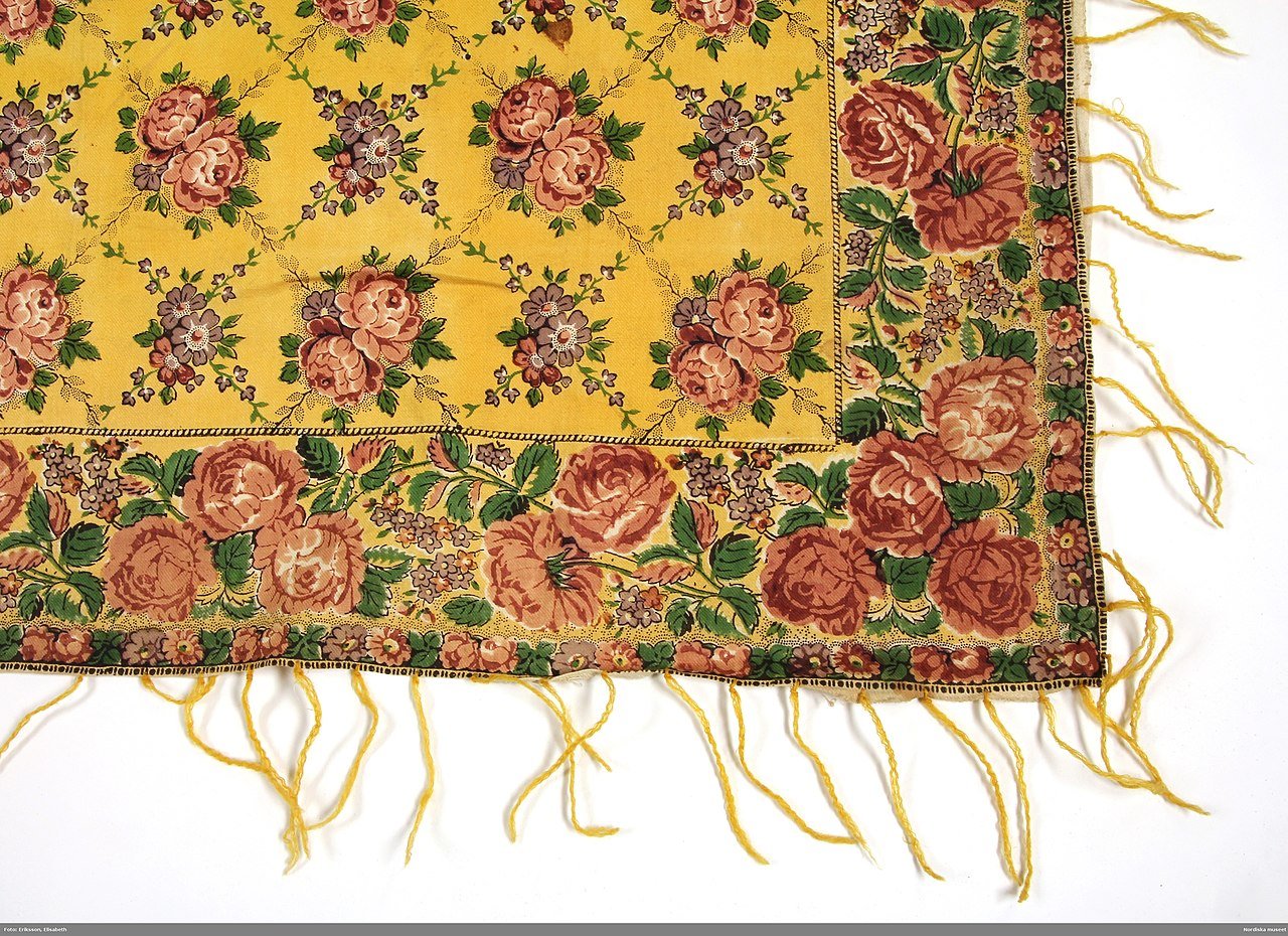 Такие тонкие муслиновые шали с набивным рисунком стали популярны как свадебные шали в середине XIX в. Некоторые шали были импортные, но было также производство в Гетеборге.