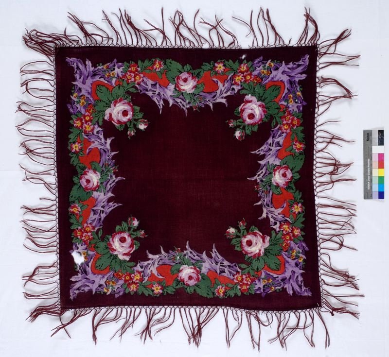 Шаль из полушерстяной саржи (хлопковая основа, шерстяной уток), с набивным рисунком из орнаментальной рамки и двух угловых букетов красного, зеленого, желтого и темно-коричневого цветов на желтовато-белом фоне.