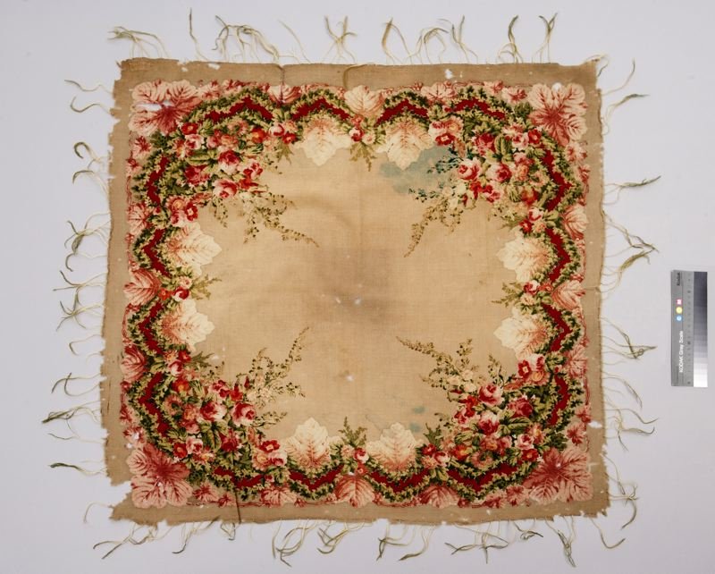 Шаль из полушерстяной саржи (хлопковая основа, шерстяной уток), с набивным рисунком из орнаментальной рамки и двух угловых букетов красного, зеленого, желтого и темно-коричневого цветов на желтовато-белом фоне.