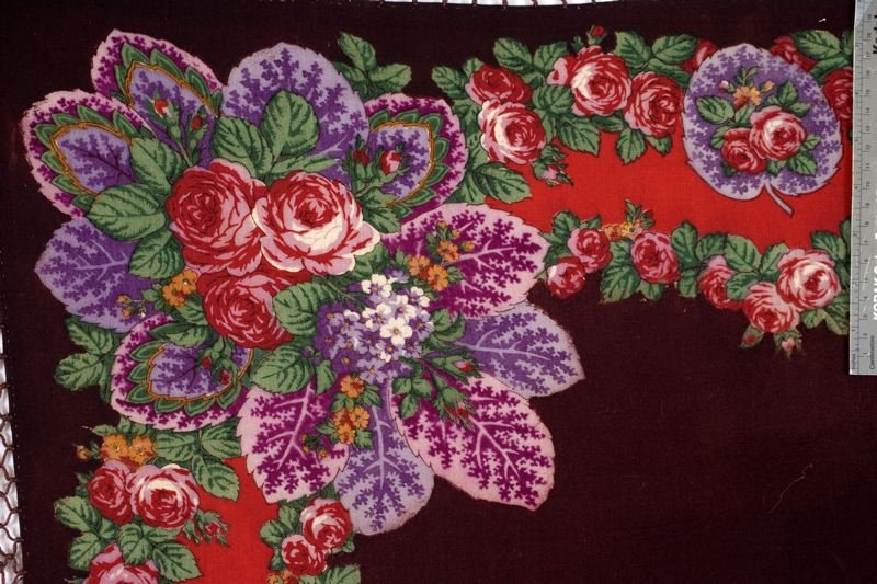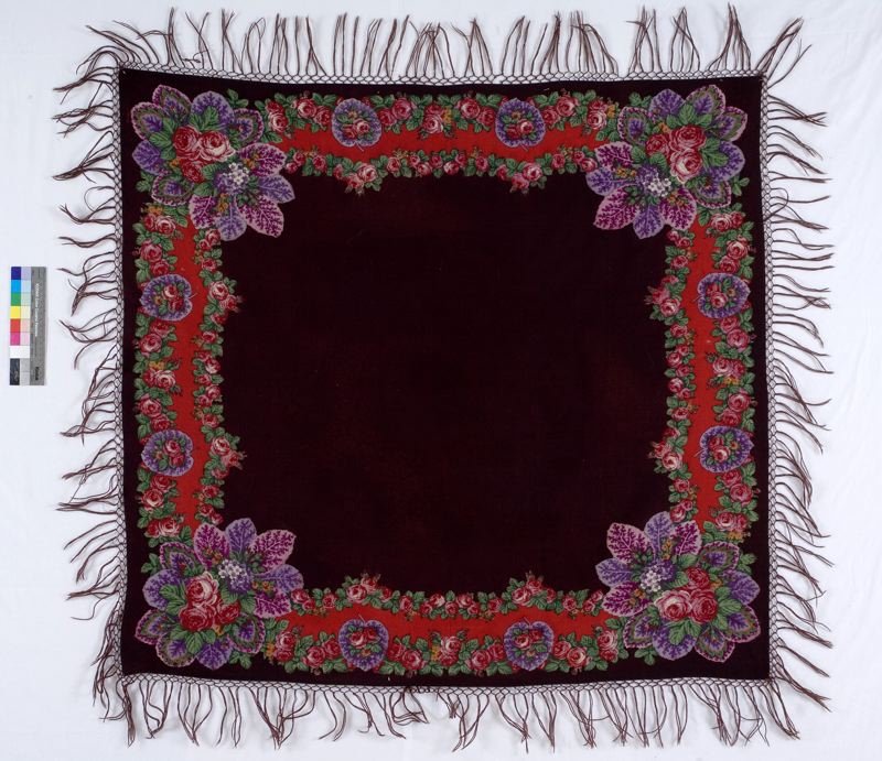 Шаль из полушерстяной ткани (хлопковая основа, шерстяной уток), набивной рисунок черно-коричневого (фон), красного, синего, зеленого и коричнево-желтого цветов.