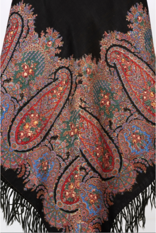 Шаль из полушерстяной ткани (хлопковая основа, шерстяной уток), набивной рисунок черно-коричневого (фон), красного, синего, зеленого и коричнево-желтого цветов.