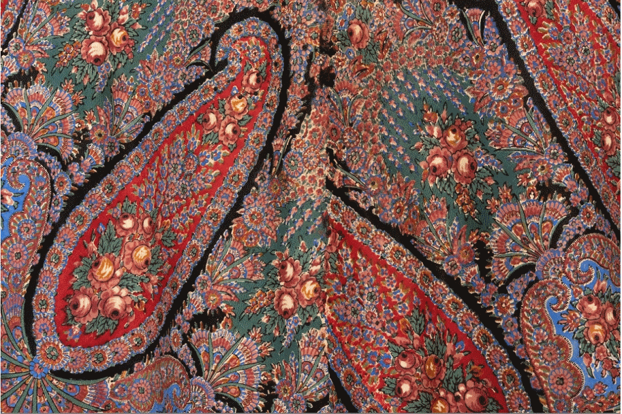 Шаль из полушерстяной ткани (хлопковая основа, шерстяной уток), набивной рисунок черно-коричневого (фон), красного, синего, зеленого и коричнево-желтого цветов.