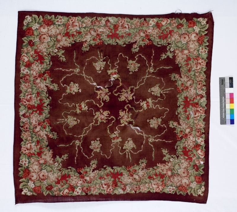 Шаль из полушерстяной саржи (хлопковая основа, шерстяной уток), с набивным рисунком из орнаментальной рамки и двух угловых букетов красного, зеленого, желтого и темно-коричневого цветов на желтовато-белом фоне.
