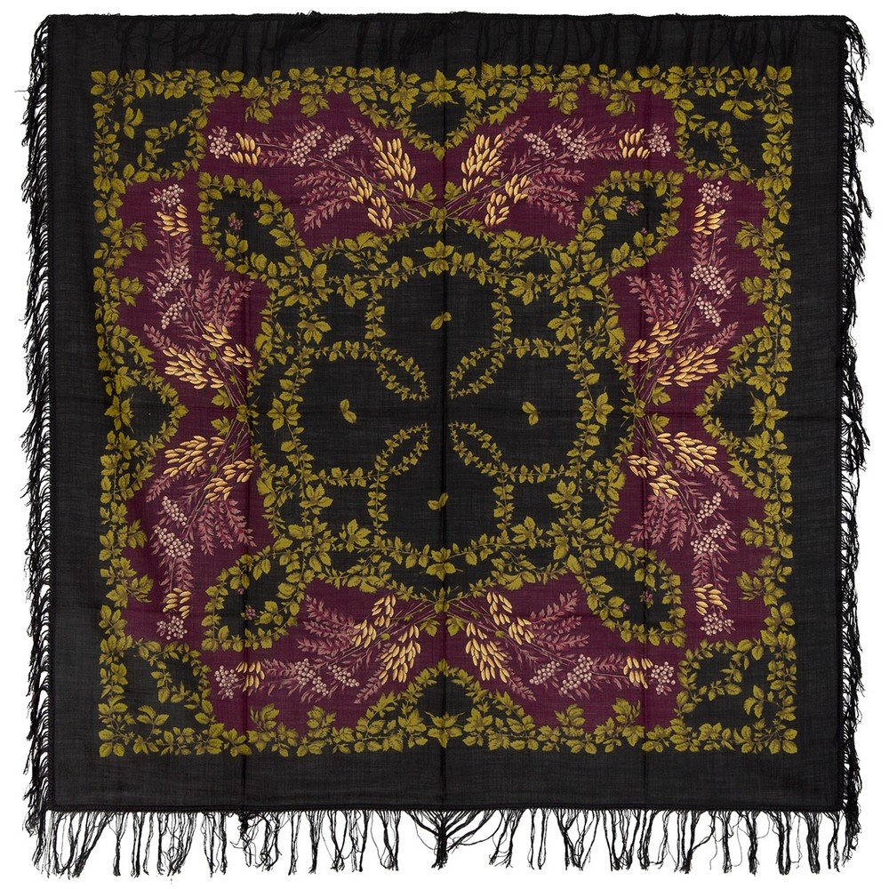 Вот фото платка "Рябина" по рисунку В.И.Зубрицкого в 20-м колорите. Печать 1999 г. Цветопередача не очень точная - теряется светло-желтый цвет крылаток, розоватый цвет ягод, и в целом платок кажется более припыленным, чем есть на самом деле.