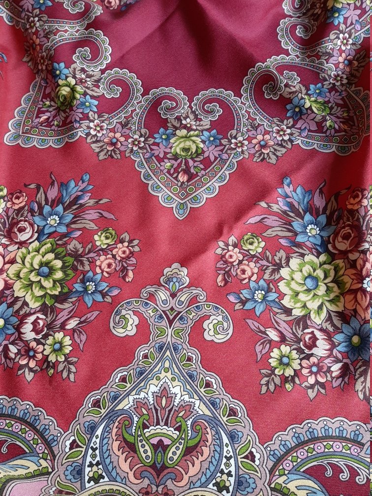 Именно так! Очень точно сказали) Малиново-неярко. Лаймовые георгины(?) придают пикантности. А чёрная кайма делает шаль более носибельной (применительно к моему гардеробу)