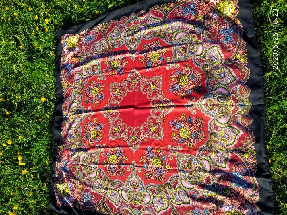 Похвастаюсь и я своей Майей-19, получила сегодня, и погода немного подыграла. на солнышке очень яркая, красивая, ничто меня в ней не смутило. В тени получается больше брусничного и более спокойная, а ушки розовые в обрамлении светлого зеленого хорошо смотрятся, букеты по углам шали и по полю спокойные, не выпячиваются, гармоничные