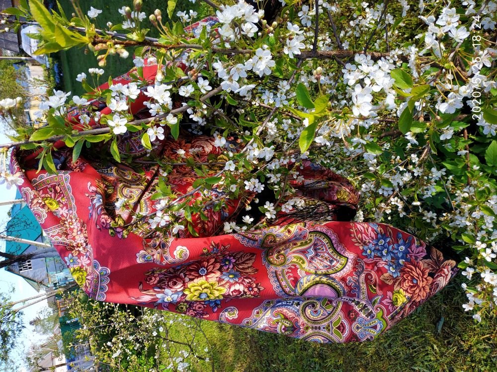 Похвастаюсь и я своей Майей-19, получила сегодня, и погода немного подыграла. на солнышке очень яркая, красивая, ничто меня в ней не смутило. В тени получается больше брусничного и более спокойная, а ушки розовые в обрамлении светлого зеленого хорошо смотрятся, букеты по углам шали и по полю спокойные, не выпячиваются, гармоничные