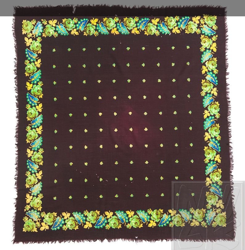 Платок кашемировый коричневый с набивным рисунком. По периметру цветочная рамка – полоса зеленых цветов и желтых и синих листьев; средник заполнен мелкими зелено-желтыми цветками