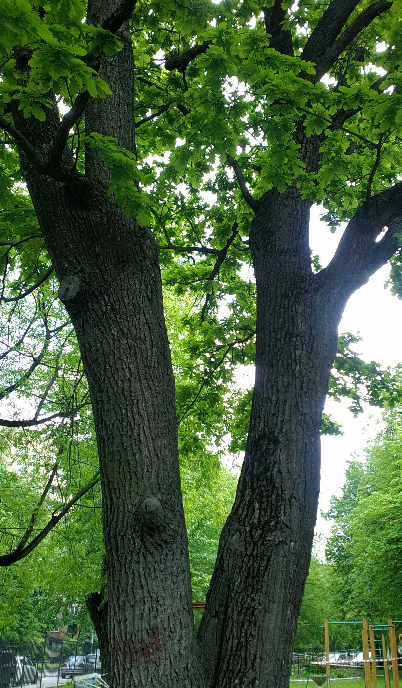 Нашла точку, с которой видно весь целиком показанный ранее огромный двойной дуб. Красавец! Наверно ему ближе к 200 лет...