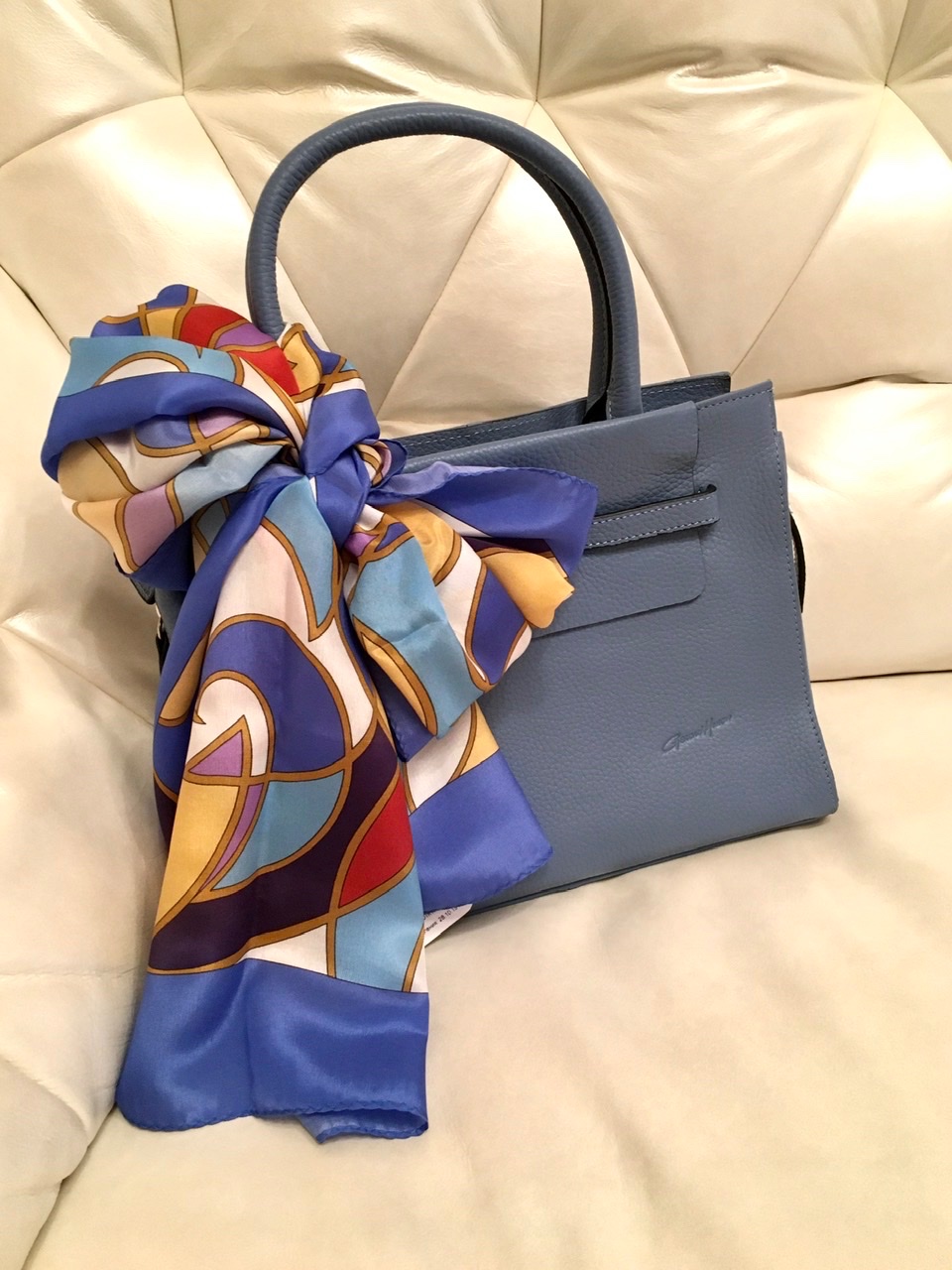 Вот покажу атласный платочек Волшебный мир вид 3 с очень подходящей голубой сумкой.