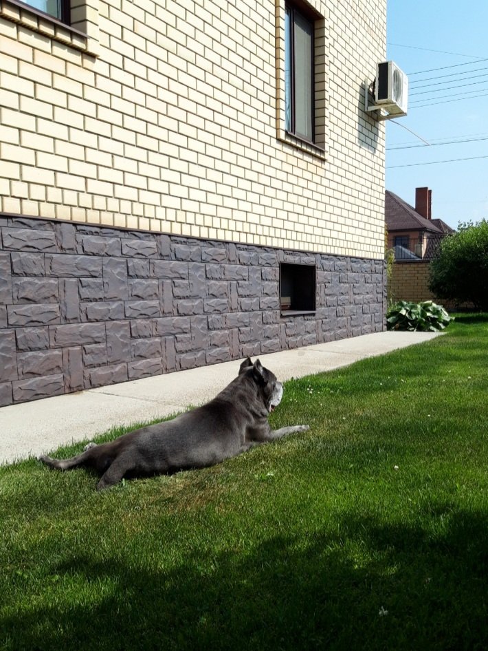А вечером, когда хозяйка по огороду/клумбам ходит, Борз укладывается на любимой площадке перед баней, в тенёчке.