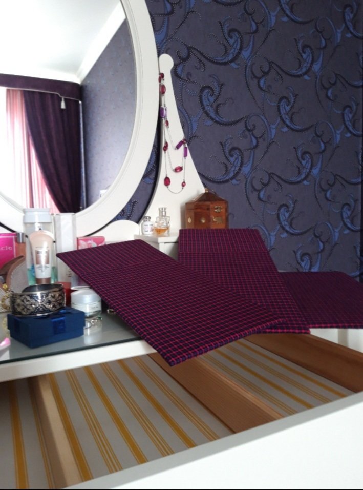 Я взяла ткань, которая сочетается с моими сливовыми шторами и обивкой банкетки. Из плотного картона вырезала основу по размеру ящичков, из старого толстого трикотажа вырезала подложку и закрепила ее на несколько капель клея к картона. И обернула подобранной пье -де-пуль - и ее тоже закрепила на обороте на клей.