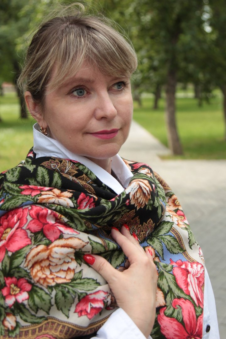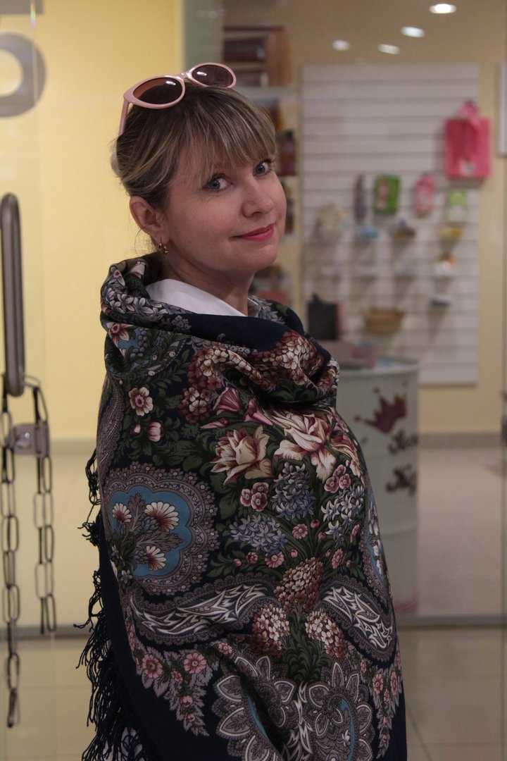 В магазине очень понравился атласный платок Белый танец, цвет достоверно не передался на фото, но всё равно красивый))