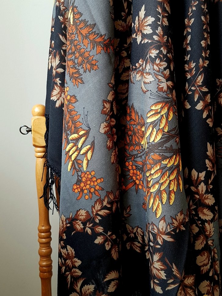 ELEN-A Лен, да - серый и медный. На многих фото серый Рябины уходит в синь и платок в целом выглядит более насыщенным цветом, контрастным, чем на самом деле. Я старалась сохранить реальный оттенок серого на фото. Он ведь глуховат, без холодка или теплоты. "Нейтральный серый". Очень интересный, "сильный" платок. Мне даже перехотелось смягчать его мрачность светлой одеждой) а захотелось, напротив, сделаться бабой ягой в украшениях из древних камней и металла с патиной. И плат - как вороньи крыла)