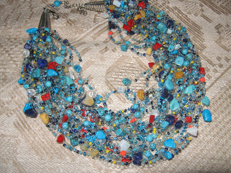 Прелестное колье, напомнило берег моря с камушками, раковинками,гладкими деревяшечками,которые приносит прибоем...Алые паруса, Ассоль, Бегущая по волнам...