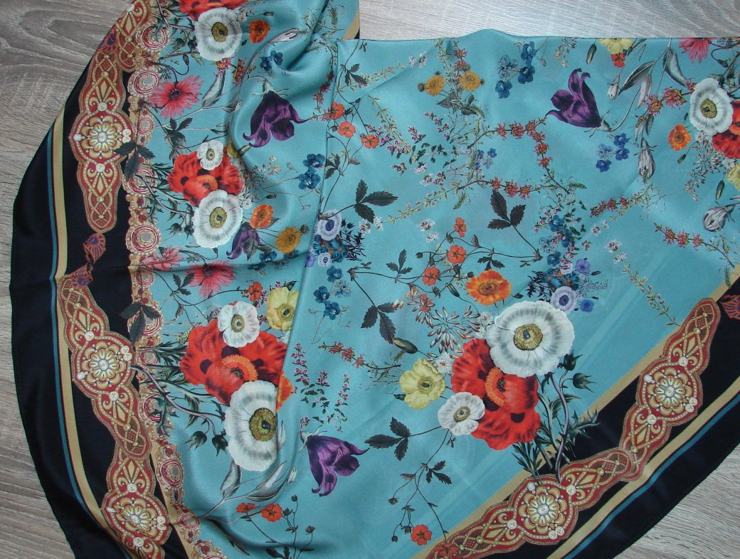 Принесла фотографии крепдешинового платочка в размере 89 см №10127-18, проект "Палитра". Дата на этикетке 21.09.16г.