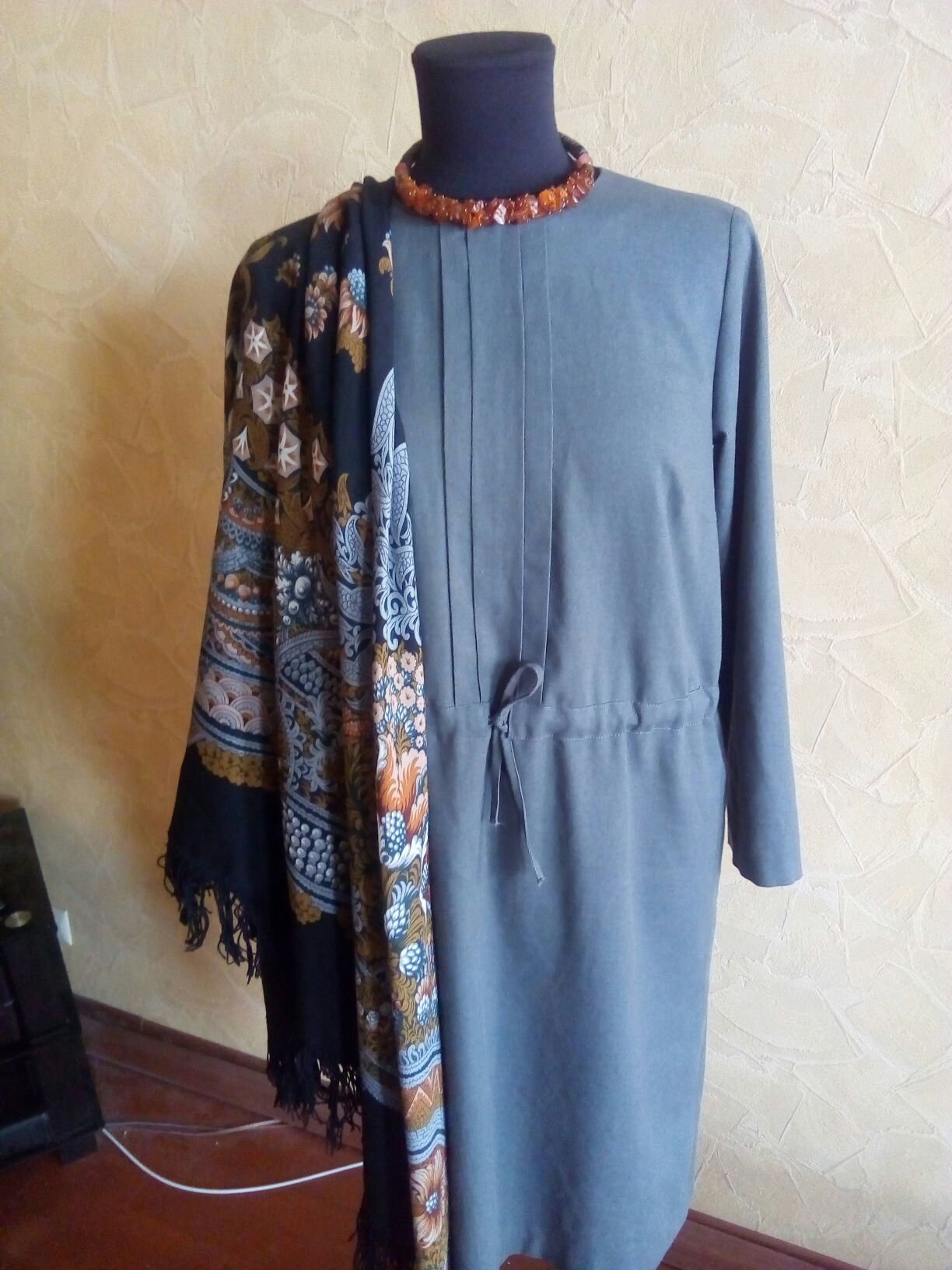 Сшила базовое платье. В кои веки себе и нехарактерно серого цвета. С Бархатной ночью 18 хорошо. Оказалось, не так просто платок подобрать, серый имеет массу оттенков.)